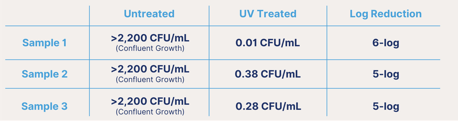 Using a customized lab protocol, test results showed that incoming municipal water contained over 2,200 CFU/mL of culturable bacteria. After UV treatment, bacterial levels dropped to 0.01–0.38 CFU/mL. This represents a 5–6 log reduction in microbial load. Because this testing method detects only culturable bacteria, it’s likely that additional non-culturable organisms, many of which are pathogenic, were also significantly reduced.
